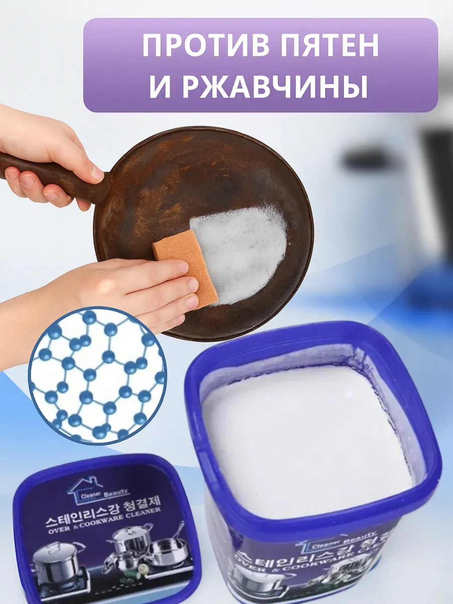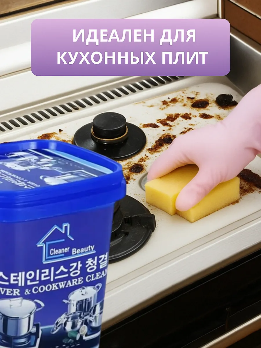 Одна паста для всего: идеально очищает кастрюли, сковородки, раковины, ванны, плиты, хром и нержавейку. Заменит целый арсенал бытовой химии.
